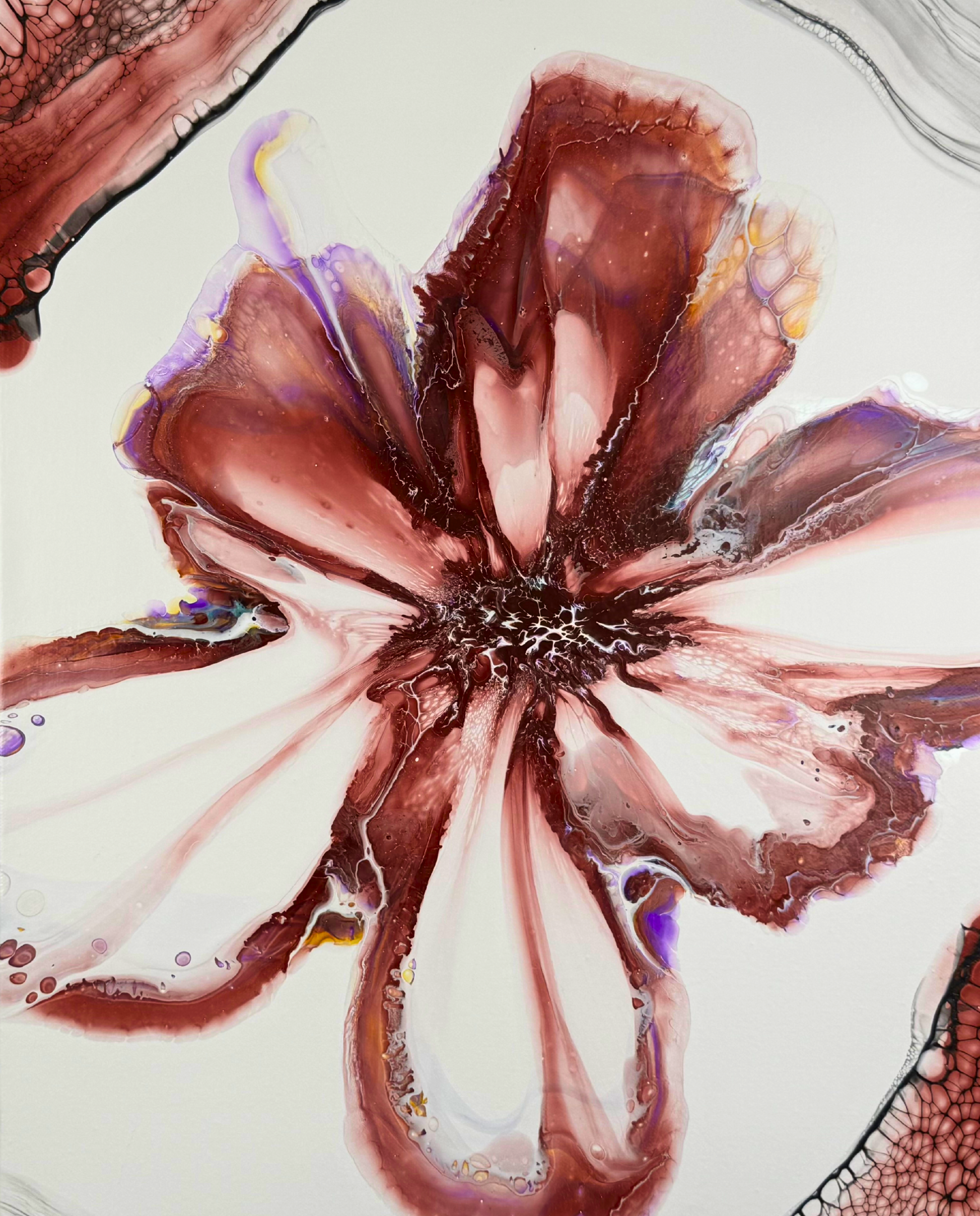Bring your space to life with this stunning 16 x 20 original abstract painting, a vibrant fusion of flowing burgundy, ivory, and violet tones that burst outward in the form of an ethereal flower. Created using high-flow acrylics and fluid techniques, this piece captures a dynamic, almost cellular texture at the core, contrasted by delicate petal-like wisps that stretch toward the canvas edge. Every detail invites the viewer into its organic movement — a floral expression that feels both grounded and dreamlike. Signed by the artist and sealed with a protective gloss varnish to preserve its vibrancy for years to come.