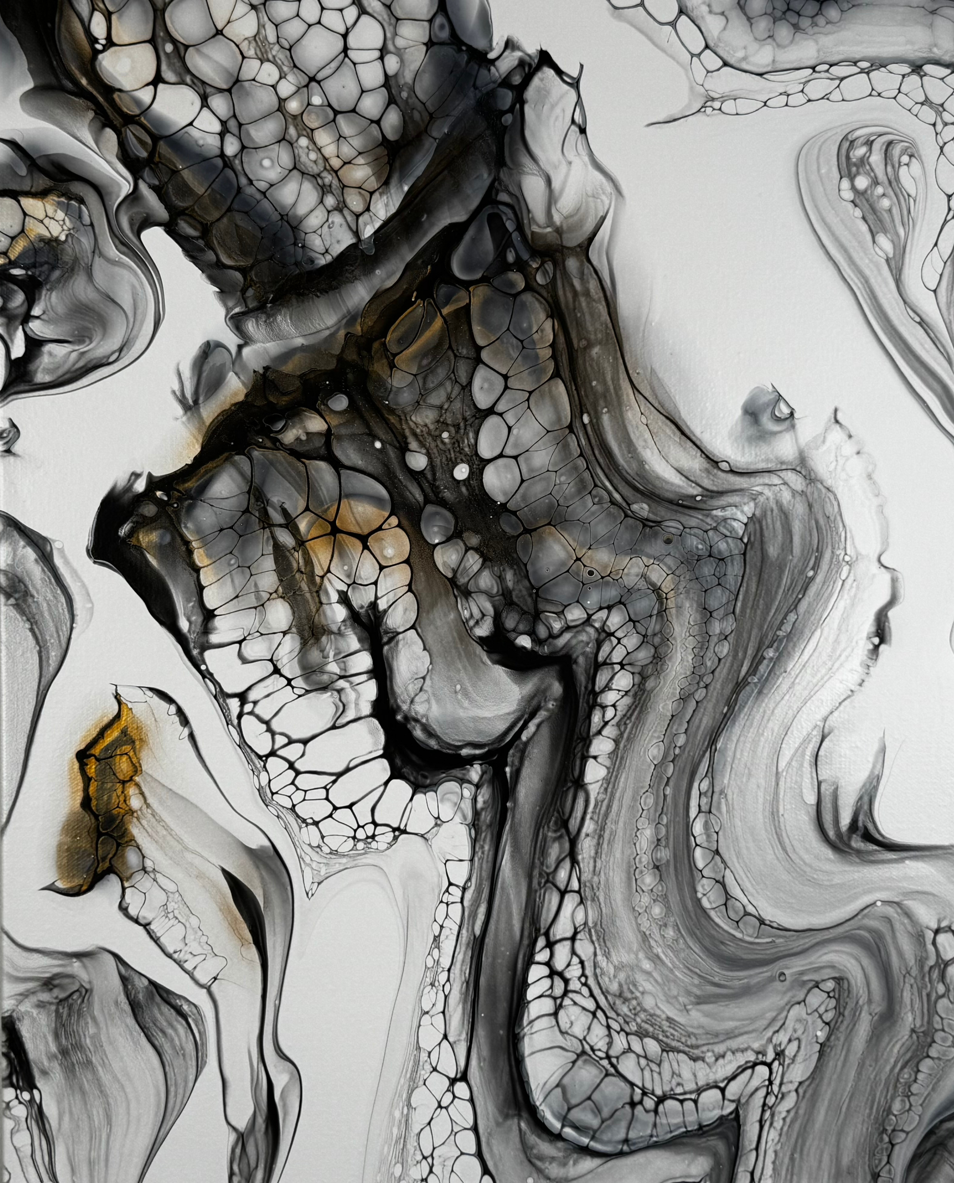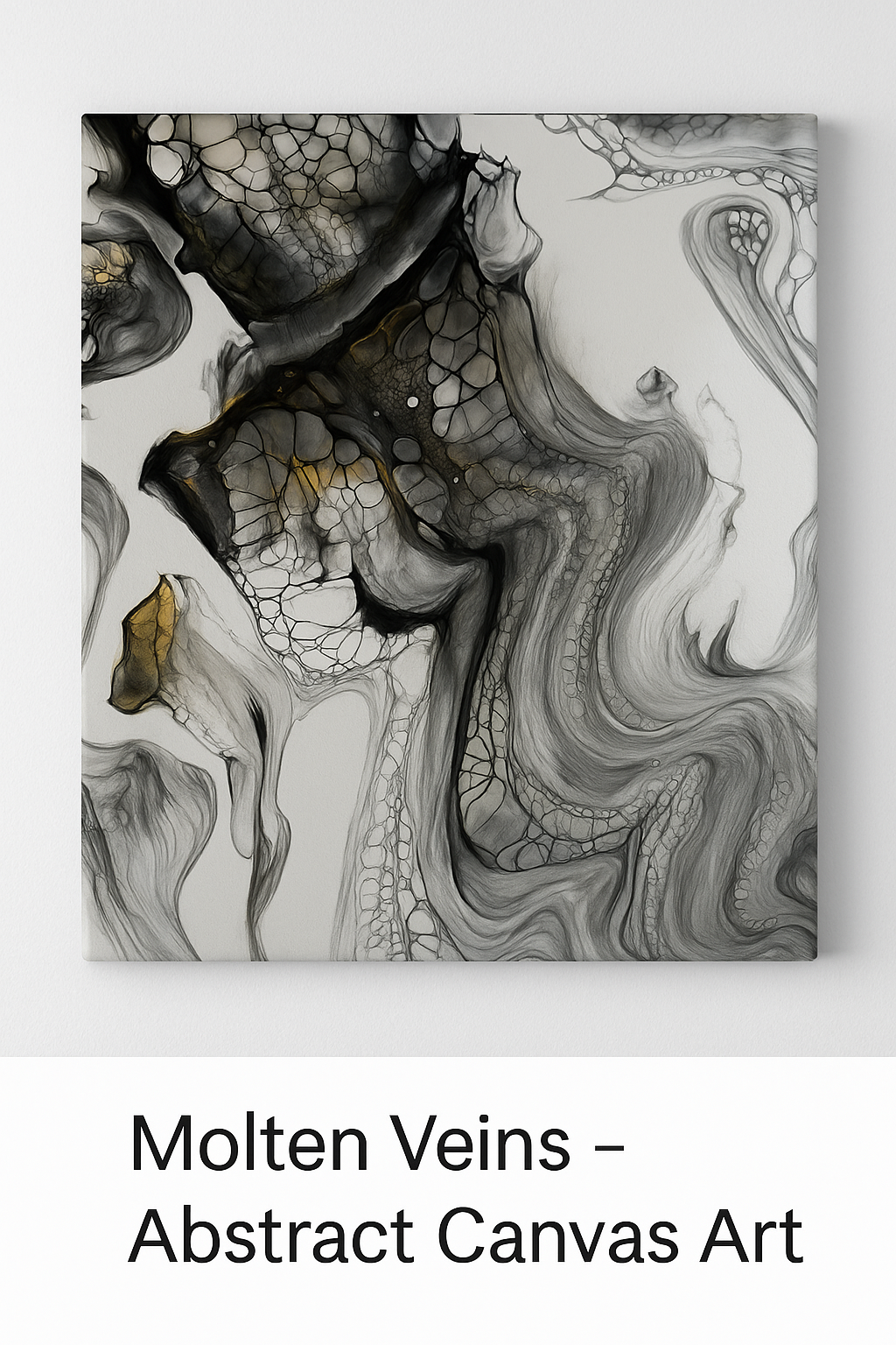 “Molten Veins” is a 16x20 original abstract painting that fuses flowing energy with structured elegance. Smoky blacks and greys drift through delicate cellular webbing, accented by rich hints of gold that catch the light and command attention. Painted on professional-grade canvas, this one-of-a-kind piece brings a moody sophistication to any space. Whether displayed in a modern living room, an executive office, or an upscale gallery wall, “Molten Veins” tells a story of transformation, depth, and movement. Signed by the artist and ready to hang.